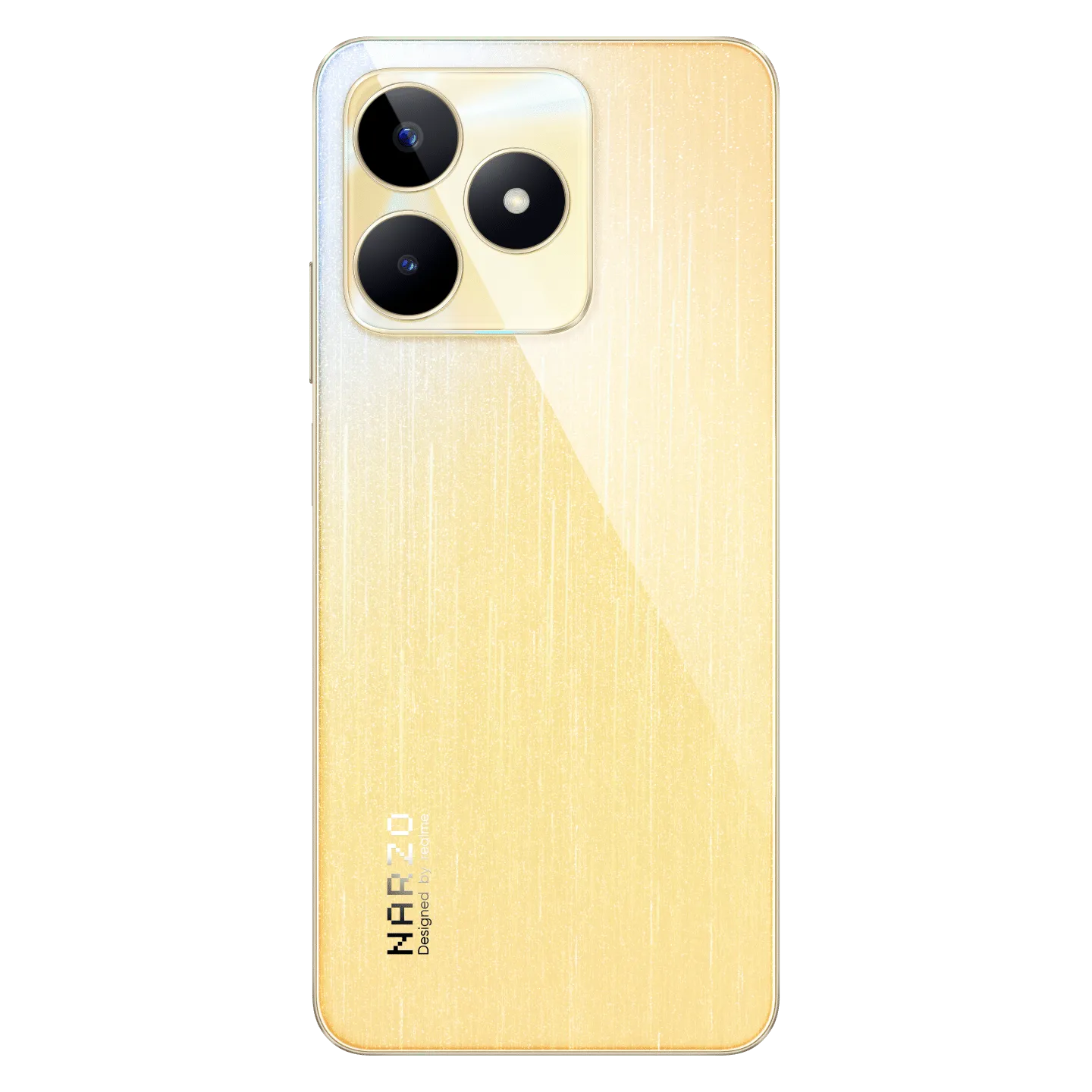 In terms of design, the Realme Narzo N53 bears a boxy form factor with flat frames. The device comes in a “California Sunshine Design” with shower-like texture patterns with 400nm thick gradient coating. You can choose between “Feather Gold” and “Feather Black” colors. Measuring just 7.49mm thick, the Narzo N53 is the thinnest Realme phone ever. Its iPhone-like camera module has caught our eye as well. Other than that, the button placements here are pretty standard.
