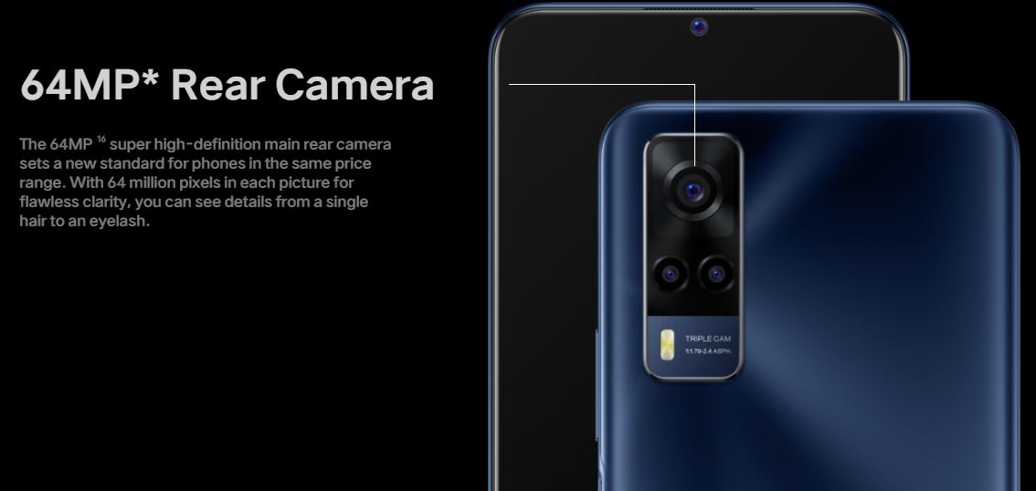 At the back, the rectangular camera module houses triple cameras. Y53s is yet another Vivo Y-series midrange phone where the ultrawide camera has been sacrificed. Here, the primary camera consists of a 64MP sensor.