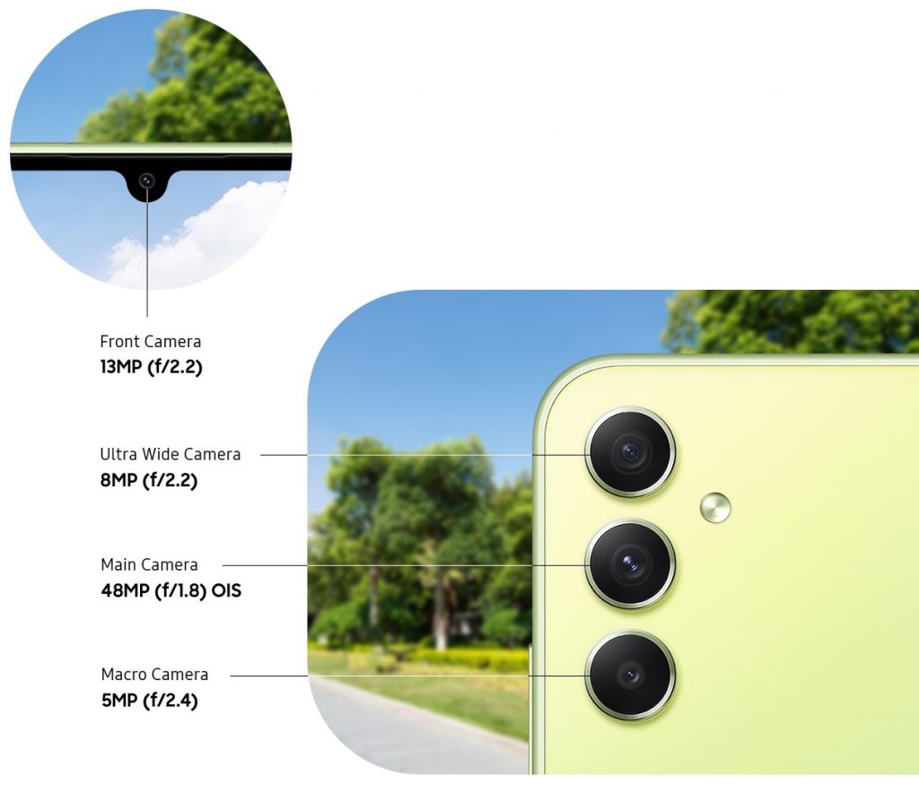 Moving on, the Galaxy A34 consists of a triple camera setup headlined by a 48MP primary sensor. The sensor also has OIS support and is accompanied by an 8MP ultrawide and a 5MP macro lens. For selfies, you get a 13MP sensor upfront.
