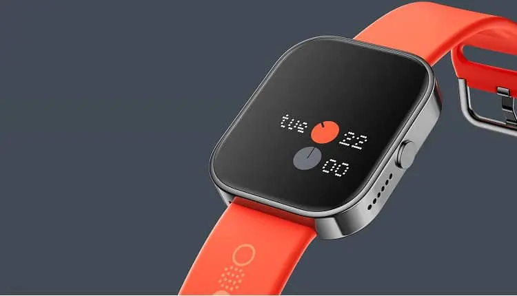The watch looks quite similar to the more expensive Apple watches. Talking about the build, it features aluminum alloy frames available in two colors: Metallic Grey and Dark Grey, while the straps come in three colors: Orange, Dark Grey, and Ash Grey. The back of the watch is made of plastic, and it also includes a dial on the side.